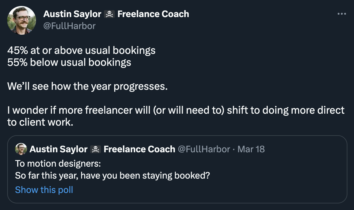 Responses to Joey and Ariel Costa are mixed. Some freelancers are doing fine/better than ever. Some haven't had work yet this year.